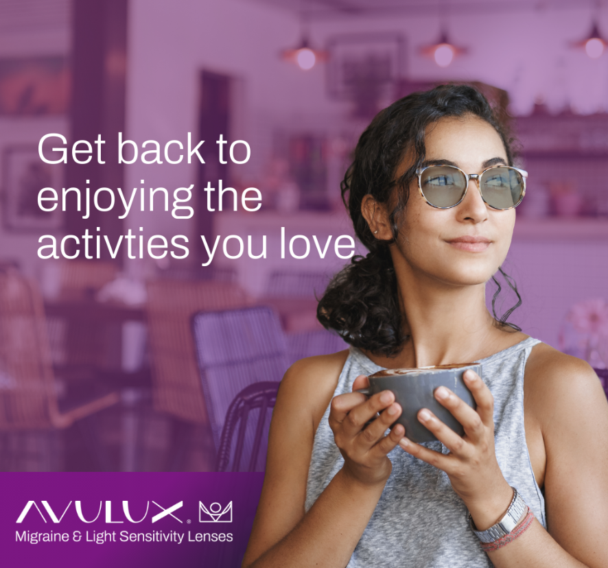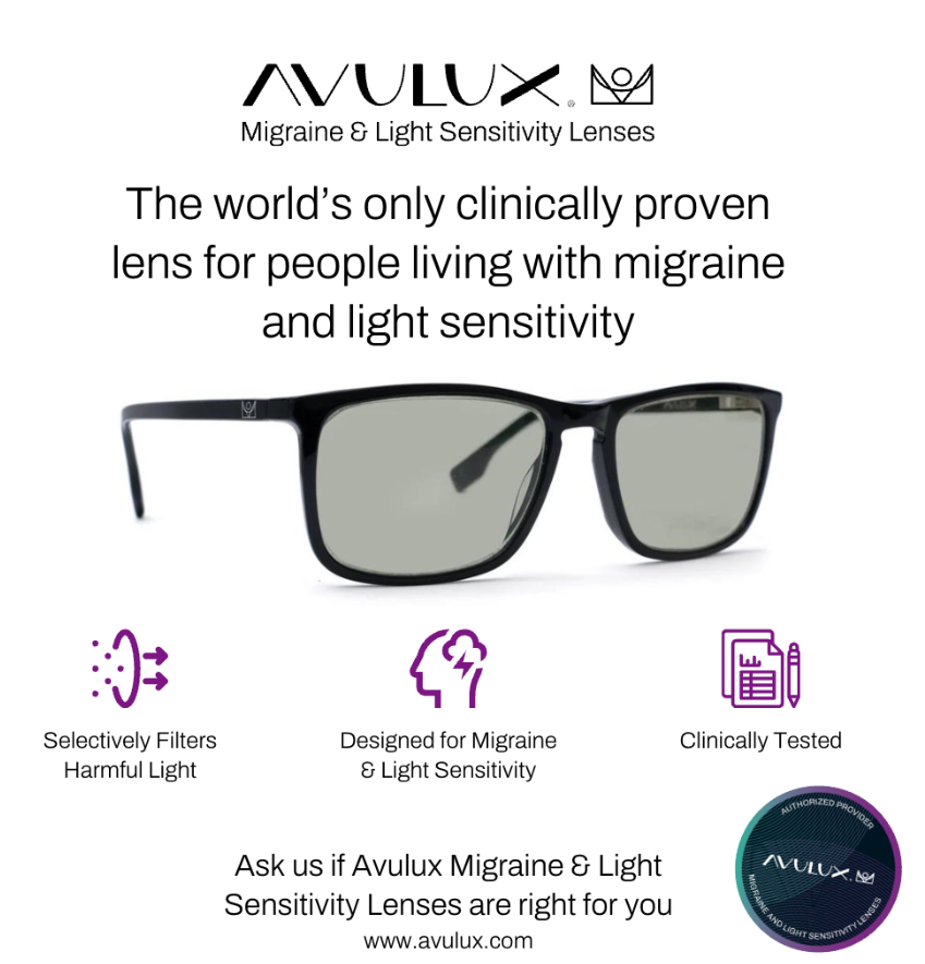 We understand how disruptive and exhausting migraines can be — affecting your work, family life, and everyday activities. That’s why we’re proud to offer Avulux® Migraine and Light Sensitivity Lenses, an innovative solution designed to help reduce discomfort from light-triggered migraine pain and photophobia.